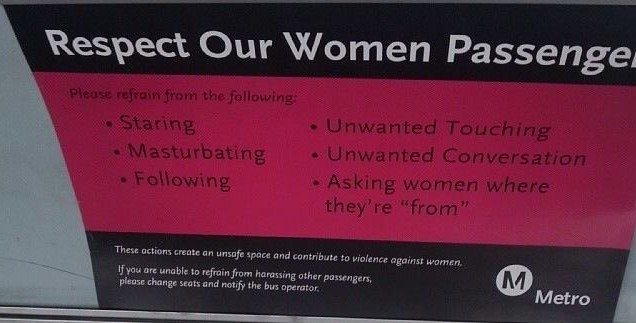 Ma forse ancora meglio hanno fatto gli statunitensi nel 2014, in particolare a Los Angeles, richiamando a sani costumi l’utenza maschile onde limitare il rischio di “violenza sulle donne”, con un illuminato manifesto apposto nei vagoni della metropolitana. Cosa dice il manifesto? Traduciamo, letteralmente, dall’inglese: