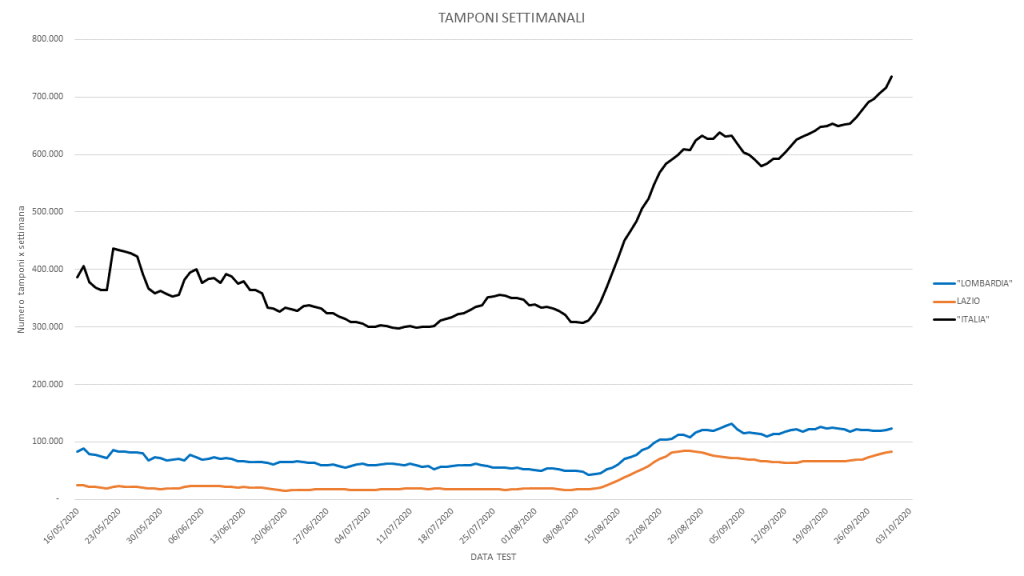 Come vedete da Maggio fino ad inizio Agosto si effettuavano in media tra i 300,000 e i 400,000 tamponi a settimana. Dalla metà di Agosto si è registrata un impennata che ha poi portato ai circa 750,000 tamponi settimanali di oggi (più di 100,000 tamponi al giorno); quasi il doppio di quanti se ne facevano due mesi fa.