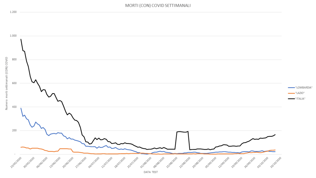 Eccomi quindi a voi. Vi presento alcuni grafici, perché spesso le immagini parlano più delle parole. Al mio solito, i dati sono “settimanali” e rappresentano il quadro dell’Italia e di due regioni campione, la Lombardia e il Lazio. Se le figure dovessero essere poco leggibili, zoomate sulla pagina.