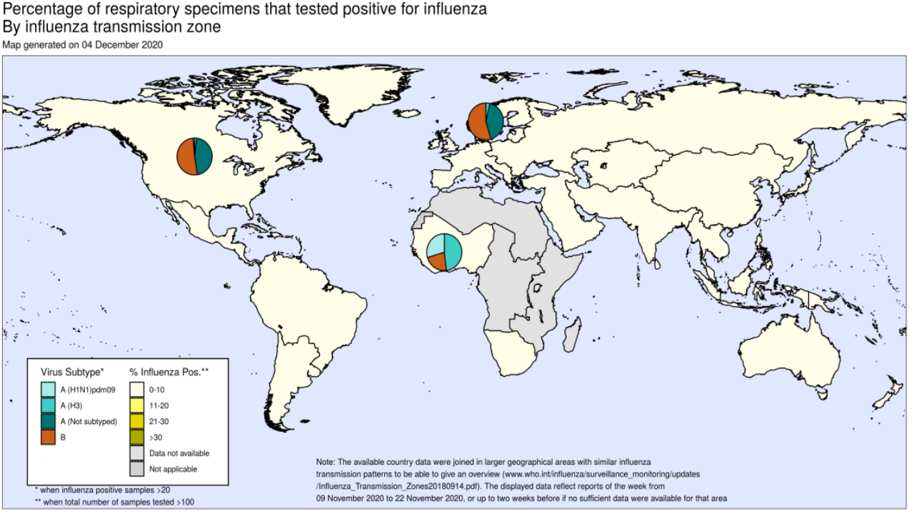 Nel continente africano il virus avrebbe infettato meno di 2 persone ogni 1000 (con 4 morti “con Covid” ogni 100,000 persone); in Africa il virus ha tasso di contagio e tasso di mortalità almeno 10 volte inferiori a quelli di Europa e America. Covid pressoché assente ma anche qui l’influenza scompare dalle carte geografiche.