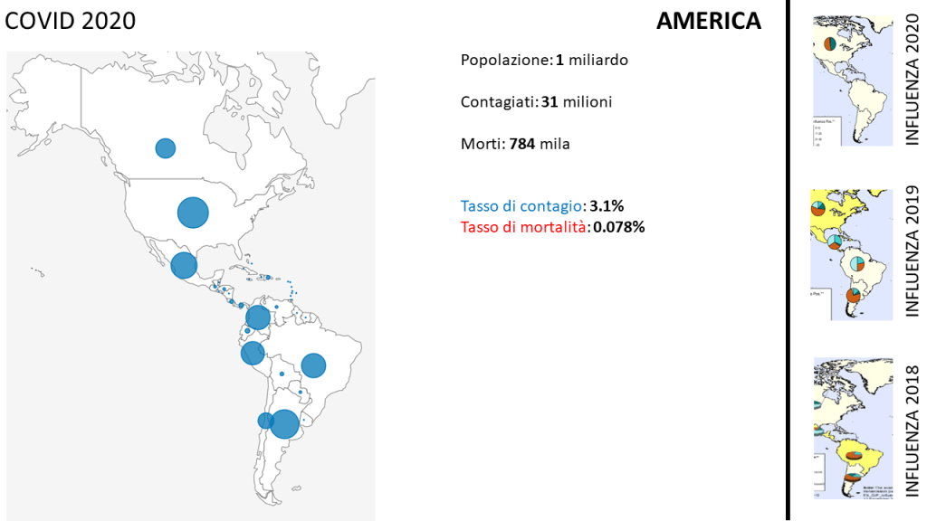 Come potrete osservare nel continente americano il virus avrebbe infettato 3 persone ogni 100 (con 78 morti “con Covid” ogni 100,000 persone); apparentemente questo sembrerebbe coerente (da un punto di vista qualitativo) con l’interpretazione “il covid ha ucciso l’influenza”.