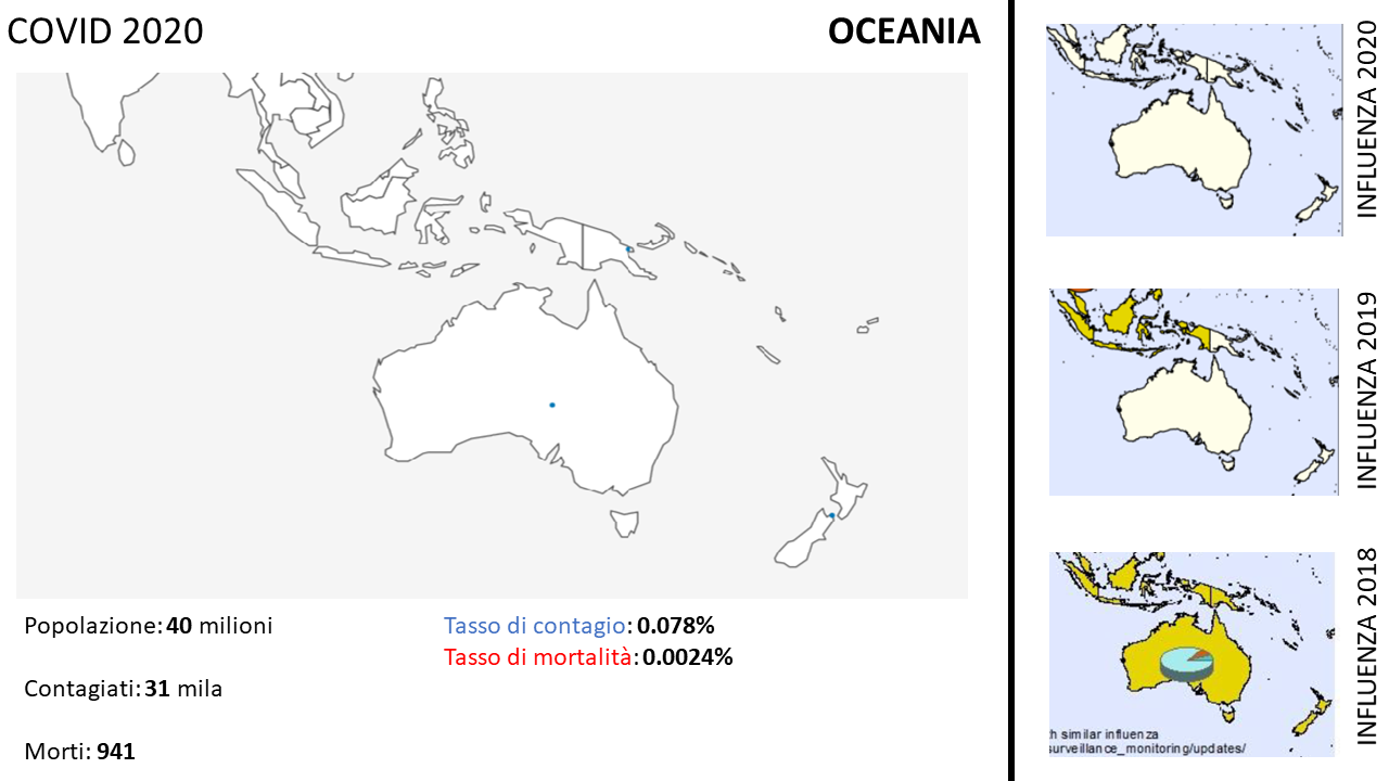 Nel continente oceanico il virus avrebbe infettato meno di 8 persone ogni 10,000 (con 2 morti “con Covid” ogni 100,000 persone); in Oceania il virus ha tasso di contagio e tasso di mortalità rispettivamente 100 volte e 30 volte inferiori a quelli di Europa e America. Covid inesistente e anche qui l’influenza scompare dalle carte geografiche.