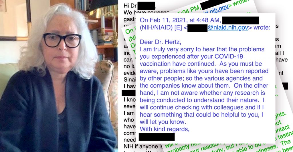 Il supplizio della dottoressa va avanti, e a Marzo del 2021 il suo caso viene sottoposto al CDC (l’Istituto Superiore di Sanità statunitense). Uno specialista del CDC invia una lettera alla dottoressa ipotizzando un problematica chiamata “mast cell disorder” tipica delle risposte allergiche, senza dare poi seguito a nulla. La dottoressa quindi contatta lo NIH (una sorta di ministero della salute, diretto da A. Fauci) inviando all’istituto e alle università di Standford e Harvard campioni del suo sangue, facendo presente che tale problematica era comune a molte altre persone (oltre 160 persone che l’hanno contattata via Facebook). Non ottengono nulla.
