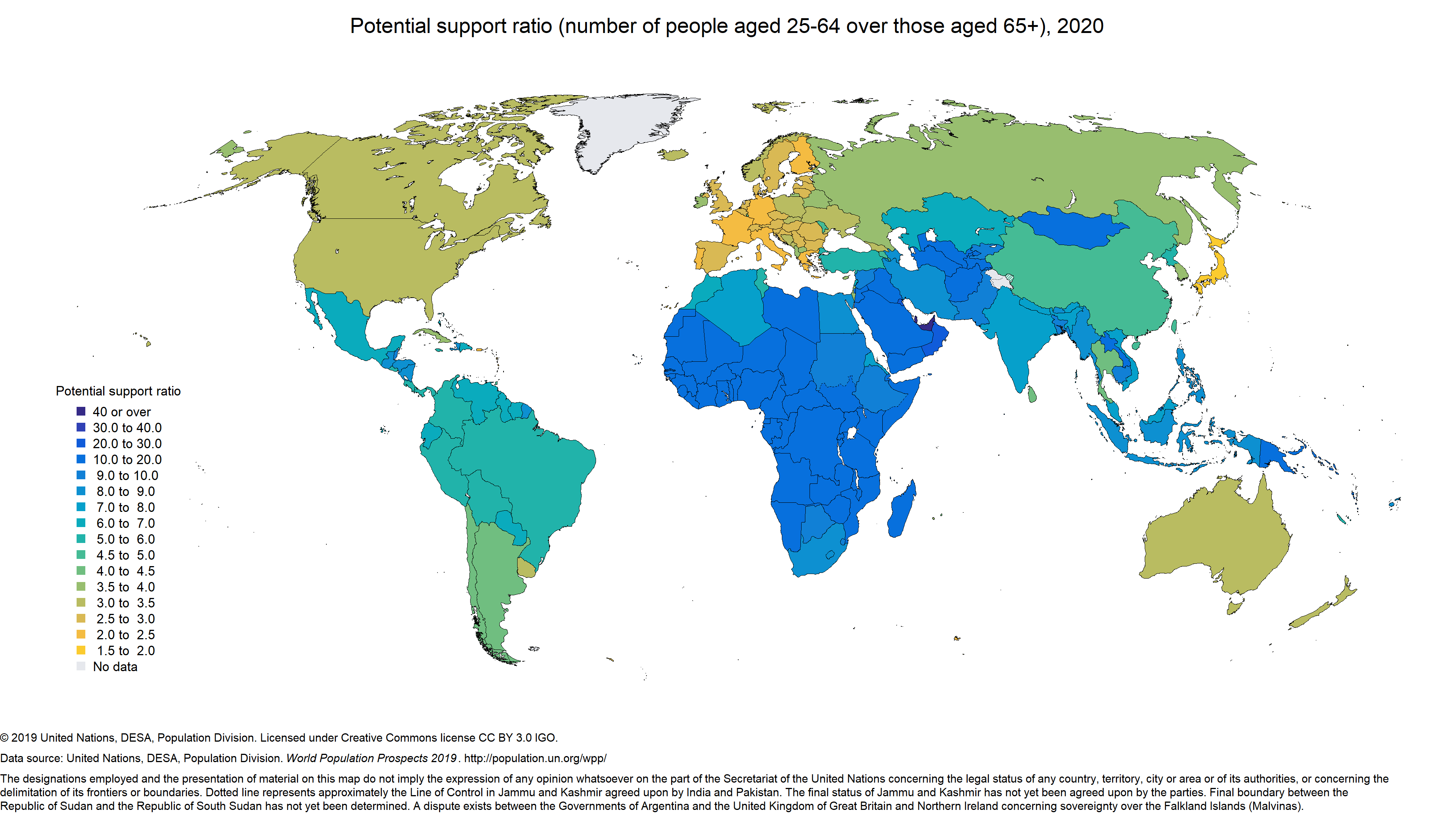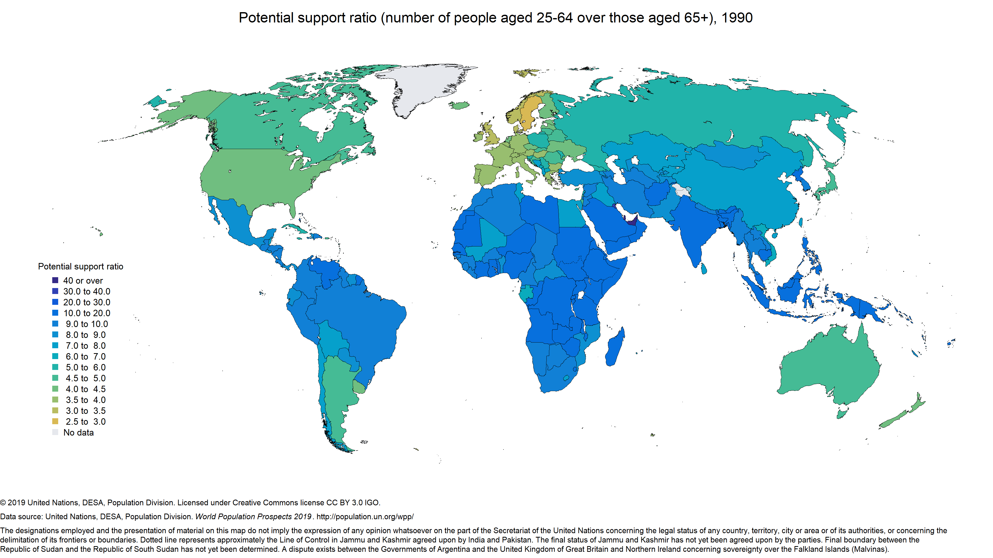 A tal proposito la Population Division presta un’attenzione Malthusiana ad alcuni indici demografici, quali la misura della sostenibilità della popolazione anziana (non lavorativa), attraverso un parametro definito “Potential Support Ratio”, che significa quante persone in età lavorativa (25-64 anni) ci sono per ogni ultra 65enne. Sotto sono rappresentate graficamente (per l’intero Mondo) tali valutazioni per il 1990, il 2020, il 2030 e il 2050.