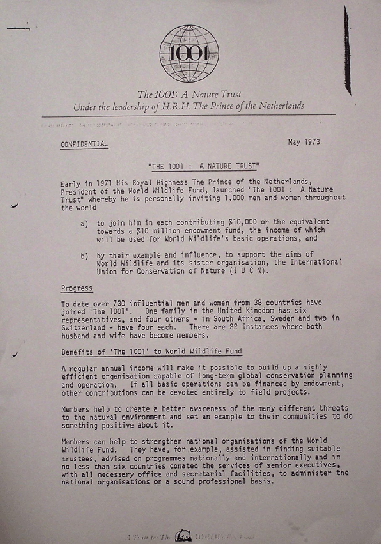 Per supportare i “lavori” di tale benefica organizzazione, fondata per puro caso da due nazisti, il Principe Nazista Filippo di Edimburgo fonderà, nel 1971, un gruppo segreto chiamato The 1001: A Nature Trust (I 1001: Un fondazione per la Natura) composto da 1001 membri appuntati su invito. Appare ovvio a tuti che un’organizzazione quale il WWF debba essere supportata da un’organizzazione segreta, elitaria, su invito, fondata da nazisti.
