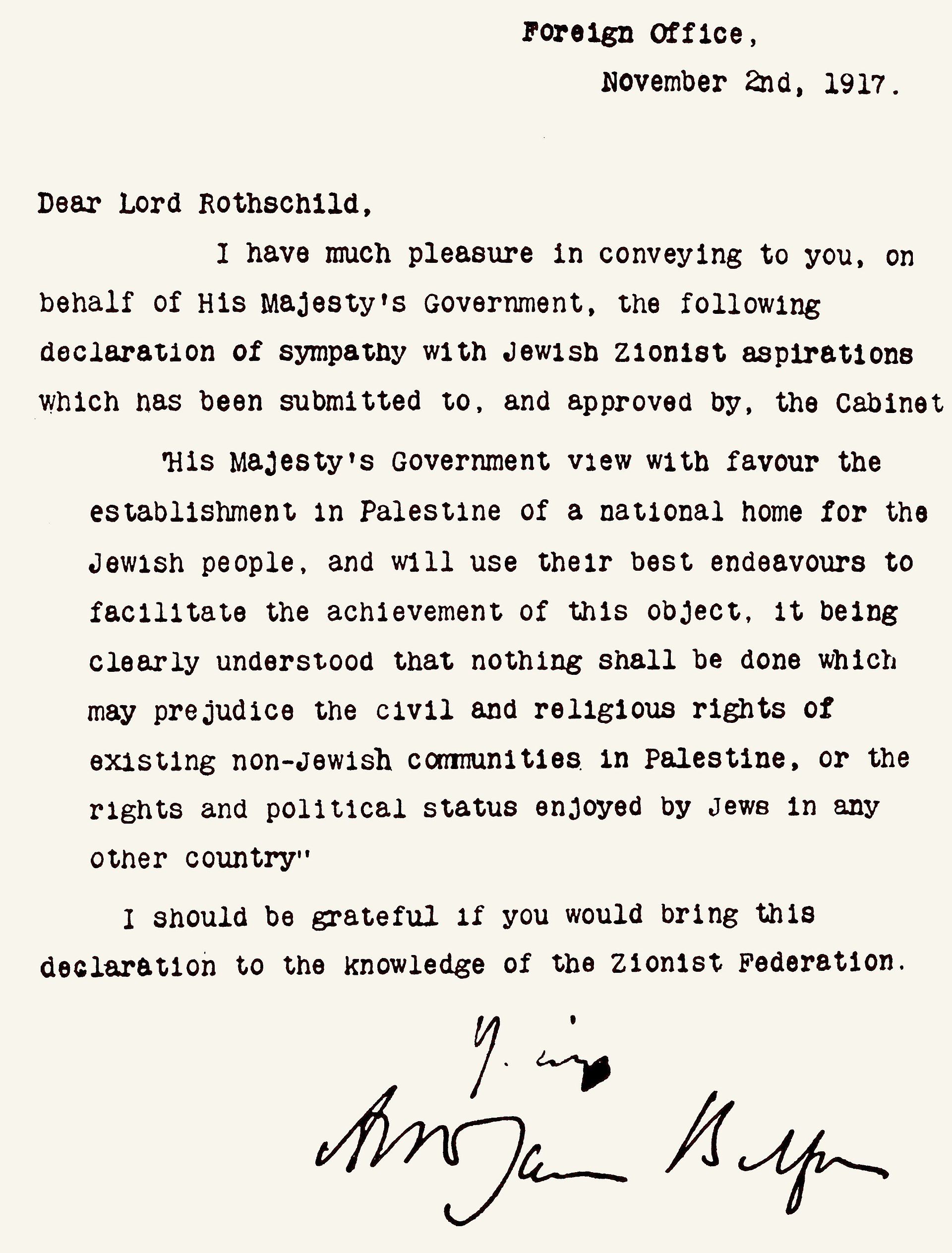 Finita la Prima Guerra Mondiale, la Palestina passava dall’Impero Ottomano alla Gran Bretagna. Il movimento Sionista ebraico guidato da Lord Rothschild espresse alla Corona Britannica il desiderio di “dare una casa” in Palestina agli ebrei sparsi nel mondo. A tale richiesta, il Primo Ministro Arthur Balfour, per conto della Corona, rispose favorevolmente attraverso la famosa Dichiarazione di Balfour del 1917; in tale dichiarazione non si parlava di fondare uno Stato ma semplicemente accoglieva favorevolmente l’idea della “casa“, ossia di insediamenti per gli ebrei che desiderassero trasferirsi in Palestina. Da poche decine di migliaia, in tre decenni, gli immigrati ebrei in Palestina crebbero fino a quasi mezzo milione e si determinarono conflitti etnici che perdurarono fino al 1947.