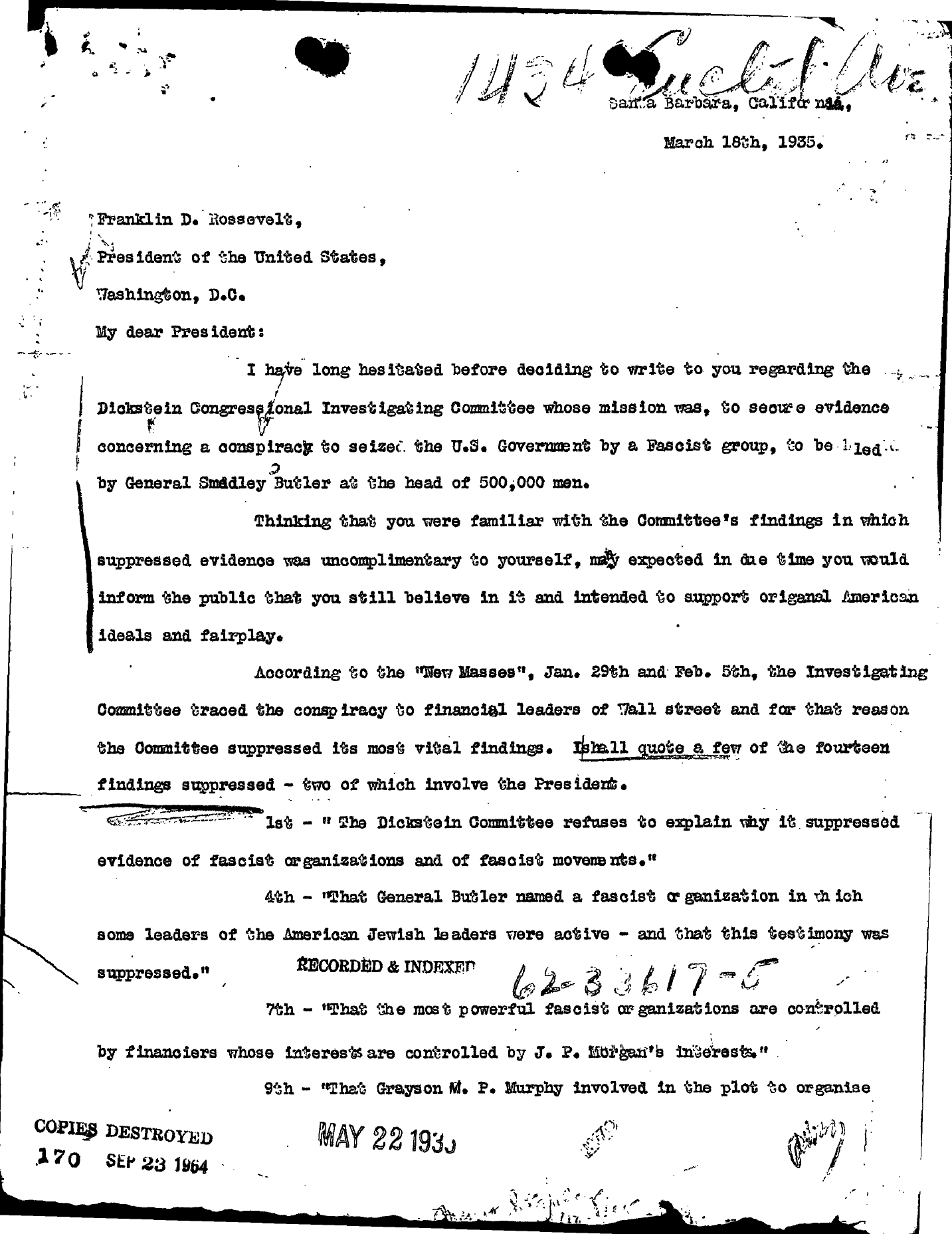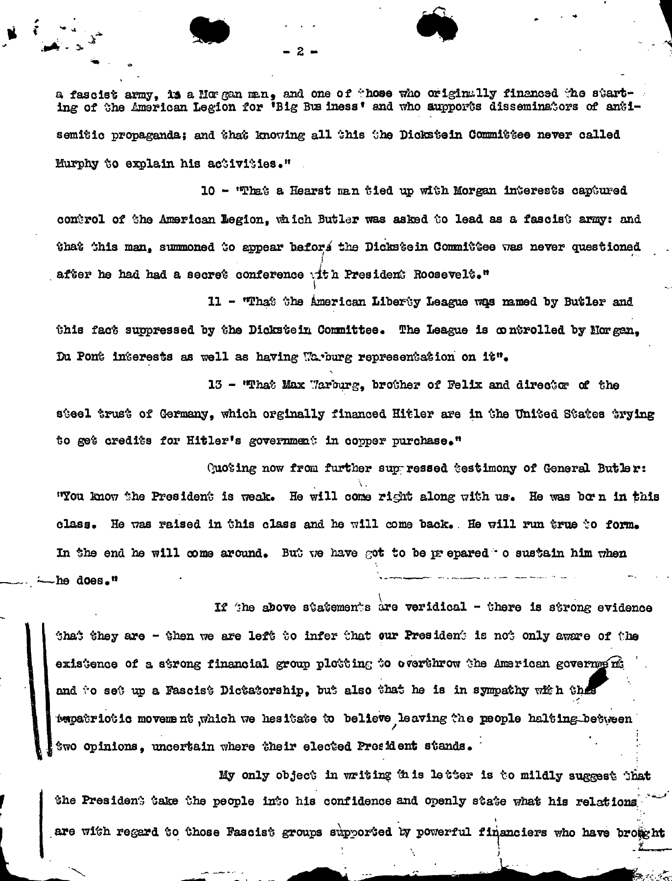 Nel mentre, una testata giornalistica (New Masses) aveva pubblicato alcuni elementi della testimonianza del Generale Smedley Butler, presenti nella relazione preliminare della commissione, che chiamavano in causa i personaggi scomodi. In basso la lettera inviata da un cittadino a Franklin Delano Roosevelt in cui si elencano le omissioni.