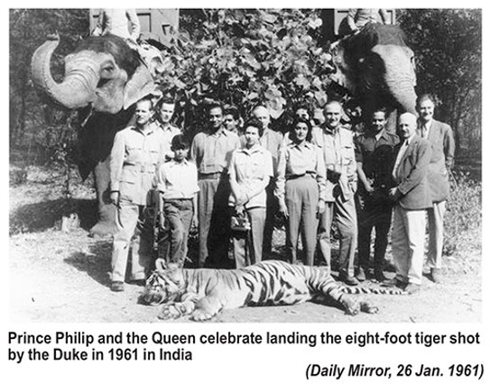 Ed infatti nel 1961, il Principe Nazista Filippo di Edimburgo, nello stesso anno in cui assumerà la presidenza del WWF, veniva ritratto mentre celebrava l’abbattimento di una tigre nel Nepal, in uno dei suoi frequenti ed abituali safari.